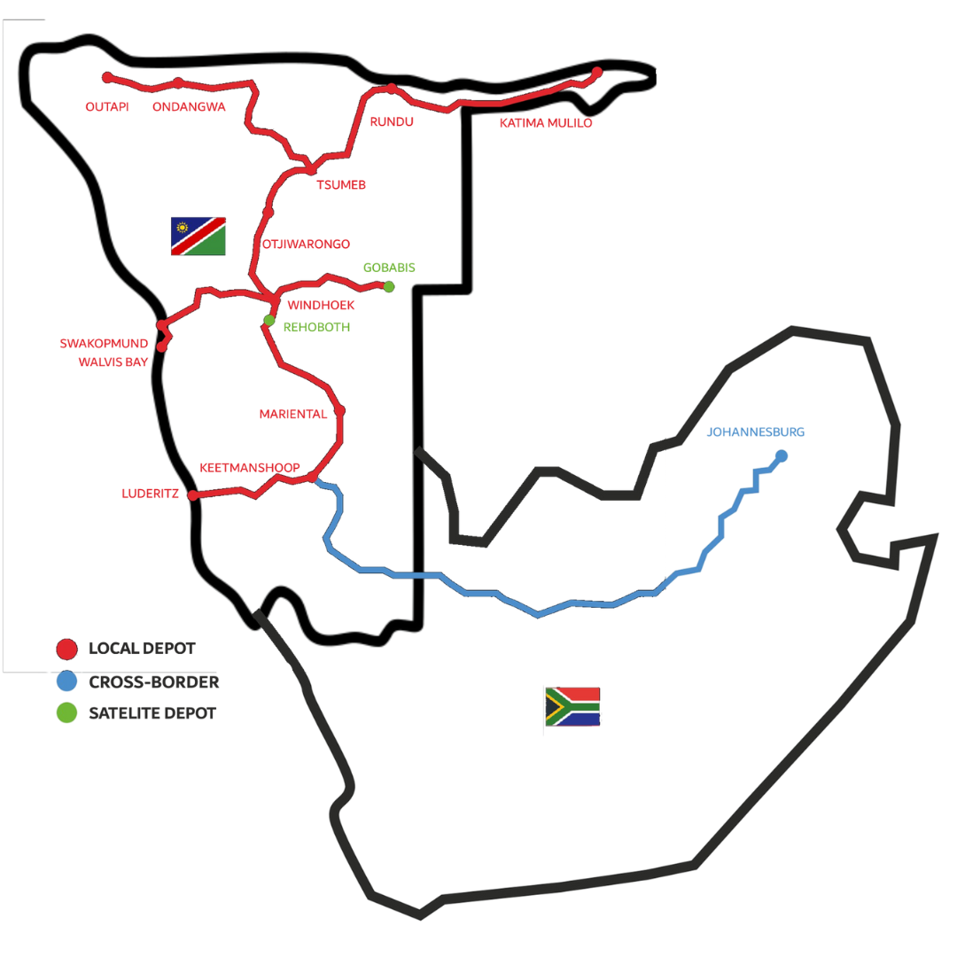 Our extensive network includes 13 strategically located Depots spanning across Namibia and South Africa. With 12 Namibian Depots,1 South African Depot & 2 Satellite Depots, facilitating efficient movement of shipments from one Depot to another and to various other destinations throughout.